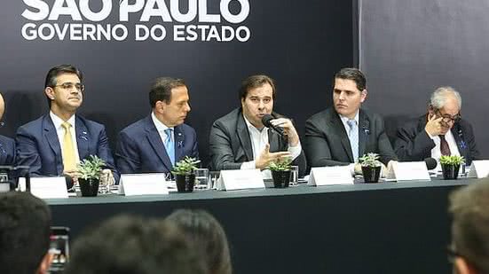 Maia participou do anúncio, ao lado do governador de São Paulo, João Doria. A proposta, entre outras medidas, cria idade mínima para aposentadoria dos servidores estaduais e aumenta a alíquota de contribuição de 11% para 14%.