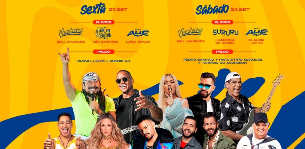 ATRAÇÕES - Nomes esperados pelo público, como Bell Marques, Durval Lelys, Harmonia do Samba e Cláudia Leitte já estão confirmados no evento, que também contará com Luísa Sonza, Tarcísio do Acordeon, Leo Santana, Rafa e Pipo Marques, Dennis Dj, Lipe Lucena e Pedro Sampaio.