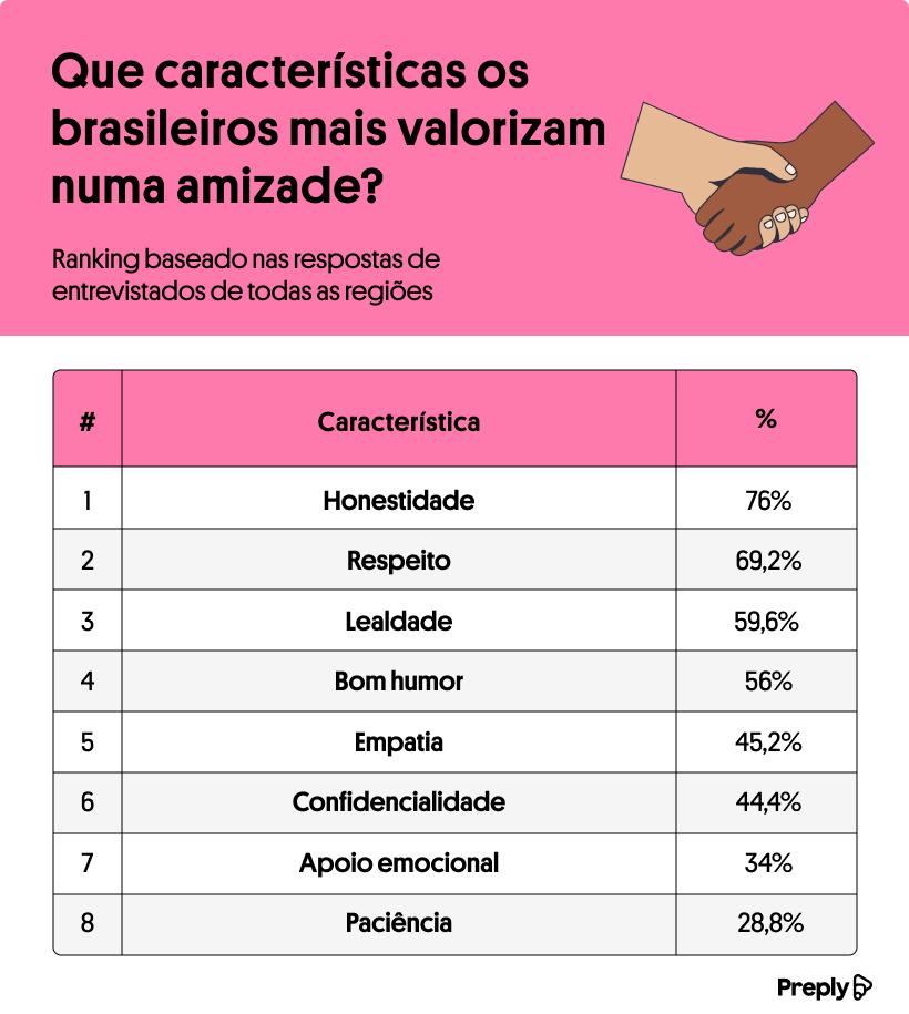 Para desvendar o relacionamento das pessoas com os amigos, durante os dias 2 e 3 de julho, 500 brasileiros conectados à internet foram questionados sobre diferentes aspectos de suas amizades, entre detalhes como seus assuntos e apelidos favoritos, as características mais importantes para o sucesso de uma parceria e os principais motivos para dar fim a esse tipo de relação. Após a coleta e análise, as respostas dos entrevistados foram dispostas em diferentes rankings, nos quais é possível conferir o percentual de cada alternativa selecionada pelos ouvidos pela Preply.