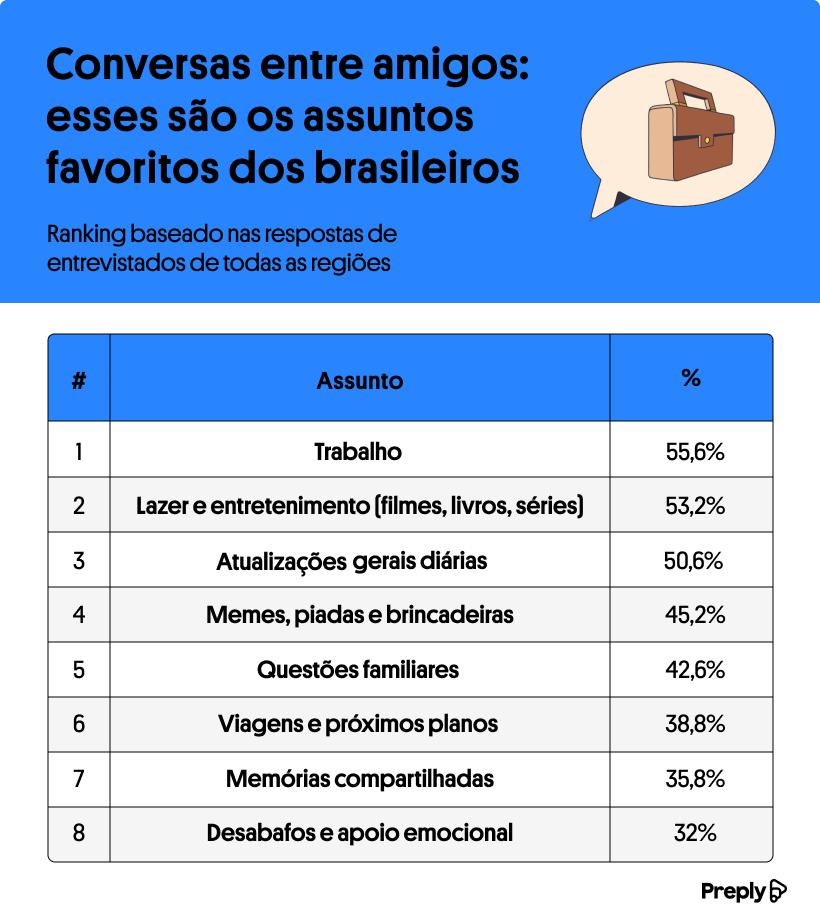 Ora, mas o que renderia tanto assunto para conversas que surgem nas redes sociais, se transformam em videochamadas e muitas vezes terminam nas mesas de bar? Provando que tudo vira assunto quando se está com alguém tão especial, os temas mais comuns nas conversas entre amigos não poderiam ser mais variados e passam por questões profissionais (55,6%), memes (45,2%) e indicações de filmes, livros e séries (53,2%).