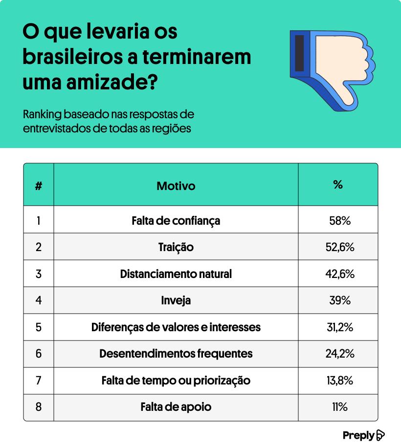 As experiências dos entrevistados pela Preply podem até não responder, mas sem dúvidas ajudam a esclarecer tal questão. Isso porque, para 58% deles, o motivo número um que os faria dar adeus a um antigo amigo seria a falta de confiança, ao lado de comportamentos semelhantes como a inveja (39%) e traição (52,6%) — não raramente, interligados a depender da situação.