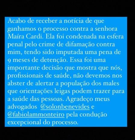 Em uma rede social, o médico compartilhou um comunicado oficial onde comemorava o resultado do caso e agradecia os seus advogados Solon Benevides e Fabiola Monteiro. “Justiça feita”, diz a legenda. Veja abaixo o post: