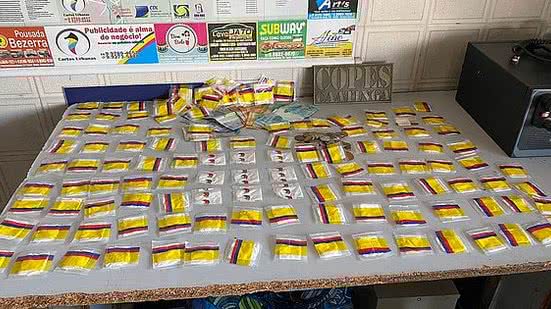 A Polícia Militar apreendeu 135 papelotes com cocaína e R$ 440 em espécie com dois suspeitos de tráfico de entorpecentes, na cidade de Delmiro Gouveia, Sertão alagoano, nesta quarta-feira, 09. O peso da droga, que estava embalada com a imagem da bandeira da Colômbia, não foi informado pela equipe de segurança.