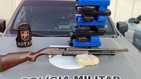 Próximo ao local, também foi localizada a espingarda calibre 12, camuflada dentro de uma embalagem de ração animal. O dono da arma e das drogas não foi encontrado.