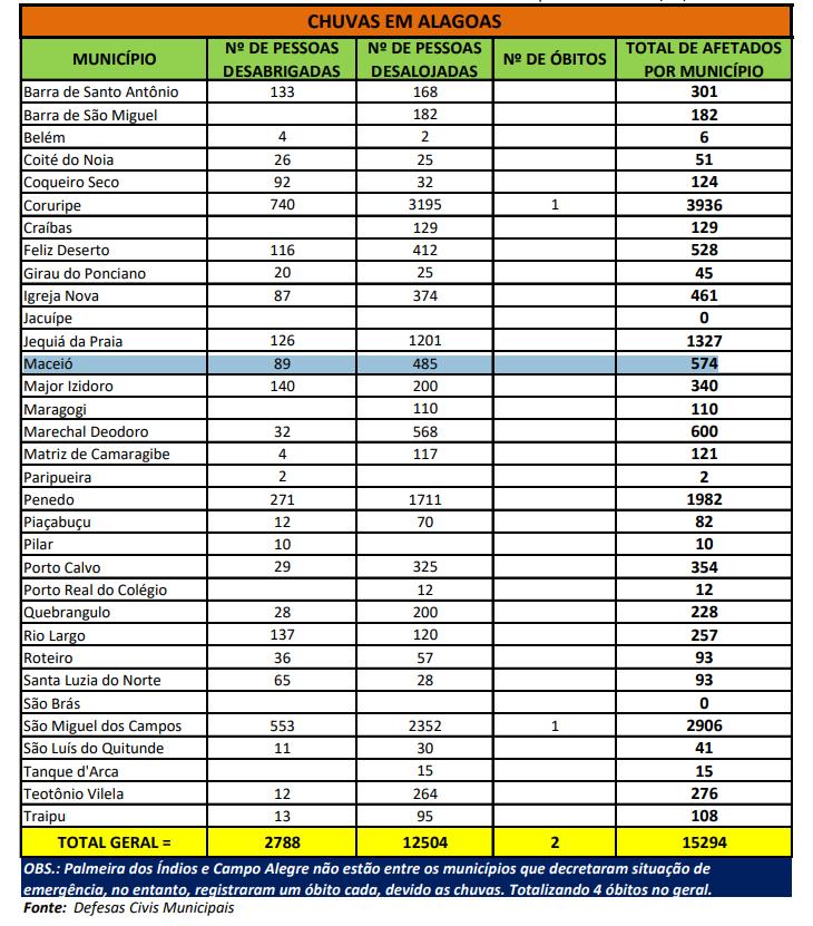 O boletim atualizado da Defesa Civil Estadual, liberado nesta quarta-feira (22), informa que 15.294 pessoas foram afetadas pelas fortes chuvas que atingem o estado de Alagoas há quase 30 dias. De acordo com o órgão, até esta quarta-feira eram 2.788 pessoas desabrigadas e 12.504 desalojadas, além de quatro óbitos registrados.