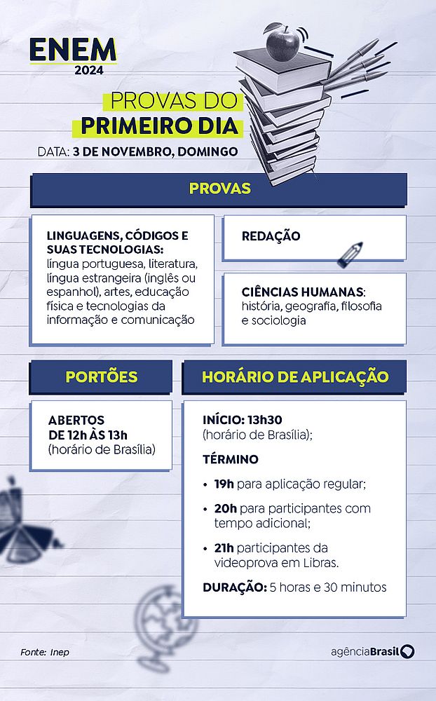 Horários e fusos - A duração da prova será de cinco horas e meia neste primeiro domingo do Enem 2024 e o término regular está agendado para as 19h, no horário de Brasília. Para o participante com solicitação de tempo adicional aprovada, o exame será encerrado às 20h. Por fim, o candidato que usar o recurso de videoprova em Língua Brasileira de Sinais (Libras) poderá concluir a prova às 21h.