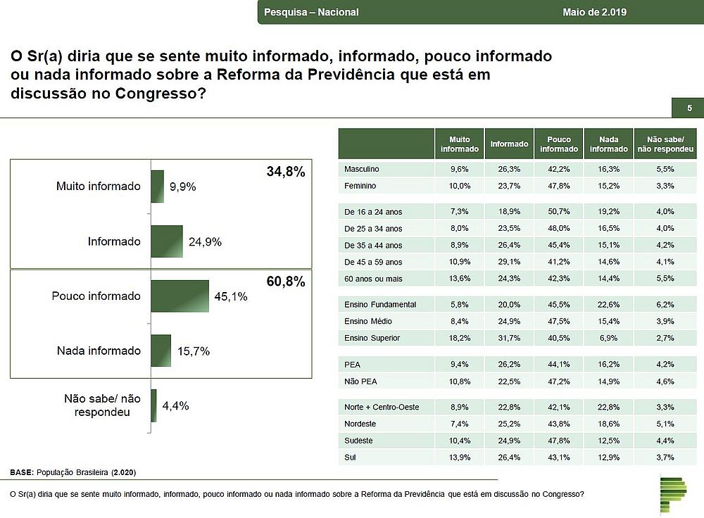 9,9% responderam estar muito informados; 24,9% disseram estar informados; 45,1% se sentem pouco informados sobre o assunto; e 15,5% não têm qualquer informação sobre a Reforma da Previdência.