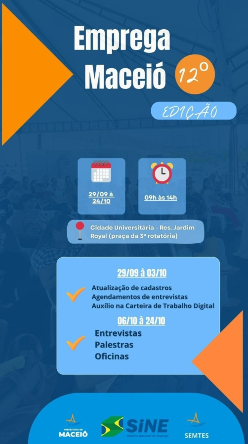 A 12ª edição do Emprega Maceió já tem data para começar e promete ser uma das mais abrangentes até agora. Entre os dias 29 de setembro e 24 de outubro, moradores da capital alagoana poderão participar da ação promovida pela Secretaria Municipal de Trabalho, Emprego e Economia Solidária (Semtes).
