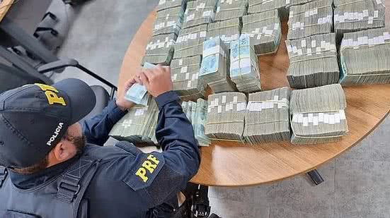 Diante das suspeitas, a equipe realizou revista no interior do veículo e encontrou quatro caixas de papelão com a quantia em dinheiro em espécie, tudo em notas de R$ 100.