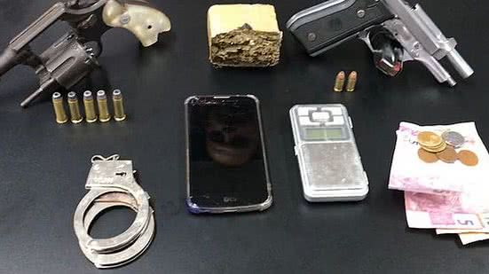 Com ele, foram apreendidos duas armas de fogo, sendo um revólver calibre 38 e uma pistola calibre 380, além de um tablete de maconha. Um adolescente que estava na casa foi apreendido.