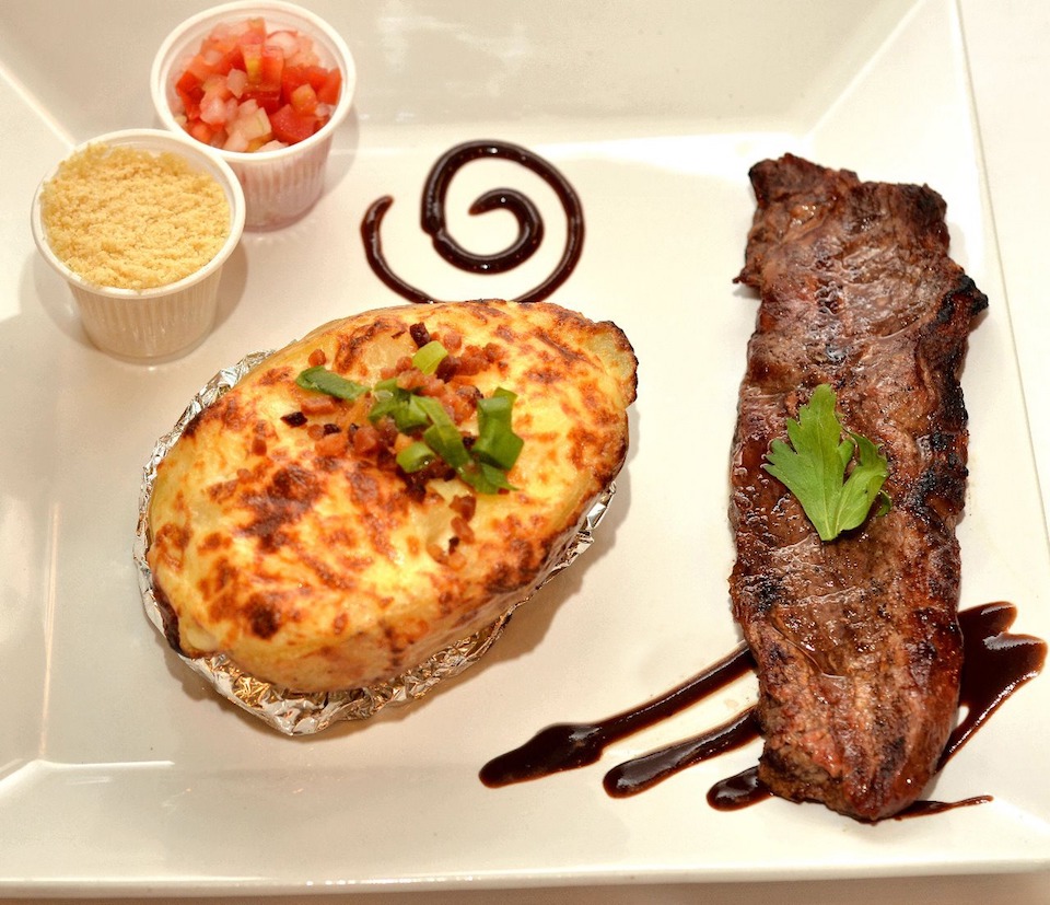 No espeto – Churrasquinhos, pão de alho e batata recheada