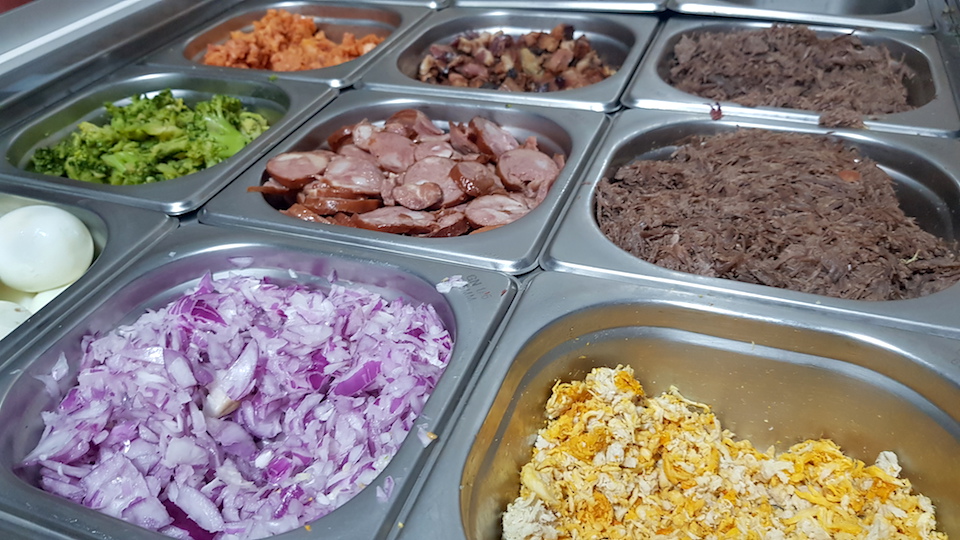 Monte seu pastel: o primeiro passo é escolher até duas proteínas. As opções são: camarão, frango, calabresa, charque, carne de sol e linguiça toscana. Segundo passo, escolher três acompanhamentos entre os 18 disponíveis, como milho, queijo, bacon, ovo… Por último, o tempero. Tem alho frito, orégano, manjericão e pimenta calabresa.