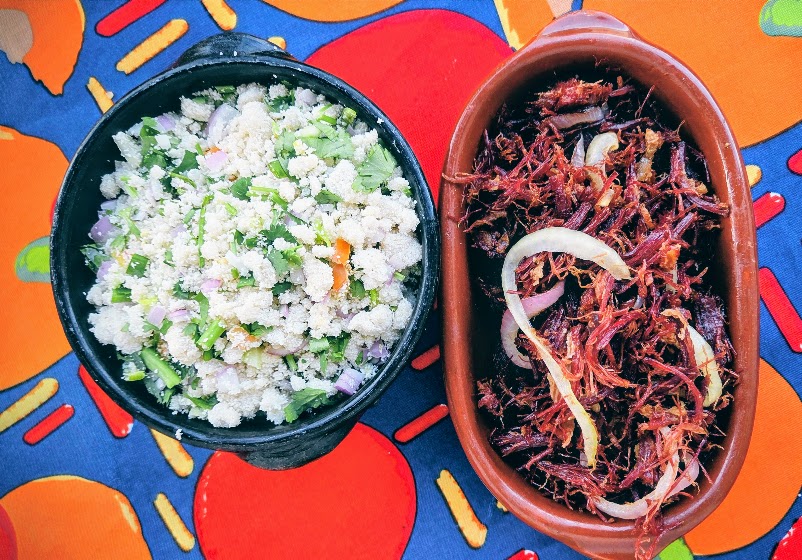 O charque no feijão é o queridinho do Tempero da Sil — bem servido, com carnes, legumes e aquele caldo grosso, do jeitinho que eu amo. Além disso, o churrasquinho preparado pelo esposo da Sil faz sucesso entre os clientes. Lugar simples, comida boa: é só chegar! Para o Festival Maceió dos Prazeres, o charque desfiado na manteiga será escoltado pela farofa d’água, tradição nordestina que não vai ao fogo: farinha de mandioca misturada na água quente, cebola roxa, tomate e coentro. É de comer rezando.