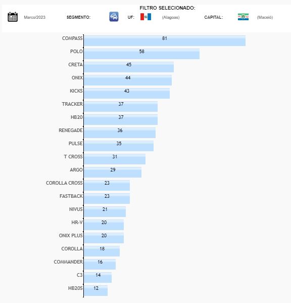 A briga pela liderança de vendas em Alagoas no mês de março acabou com o VW Polo na primeira posição com 102 unidades emplacadas. Foram apenas 3 unidades a mais que o Jeep Compass que repetiu um excelente desempenho e emplacou 99 unidades em março em todo o estado.