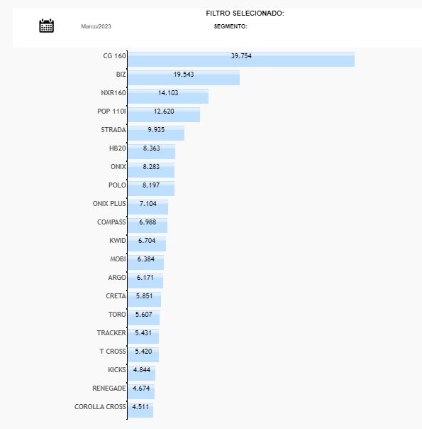 Completaram o Top 5: Chevrolet Onix com 72, Fiat Pulse com 64 e Hyundai Creta com 62 unidades emplacadas.