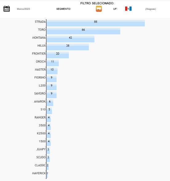 Completam o Top 5: Toyota Hilux com 38, Nissan Frontier com 20 e Rneault Oroch com 11 unidades emplacadas. Confira o Top 20: