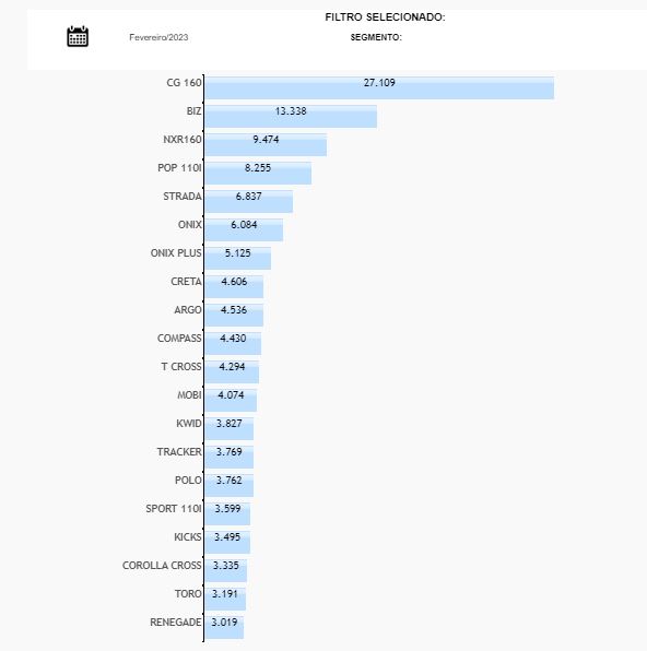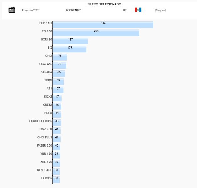 Já somando todos os veículos emplacados no estado, a liderança absoluta ficou como sempre com a Honda Motos e sua Pop 110i com 534 unidades emplacadas. Destaque também para a Fiat Strada com 66 unidades emplacadas, ficando na 3ª posição entre os carros. Confira o top 20: