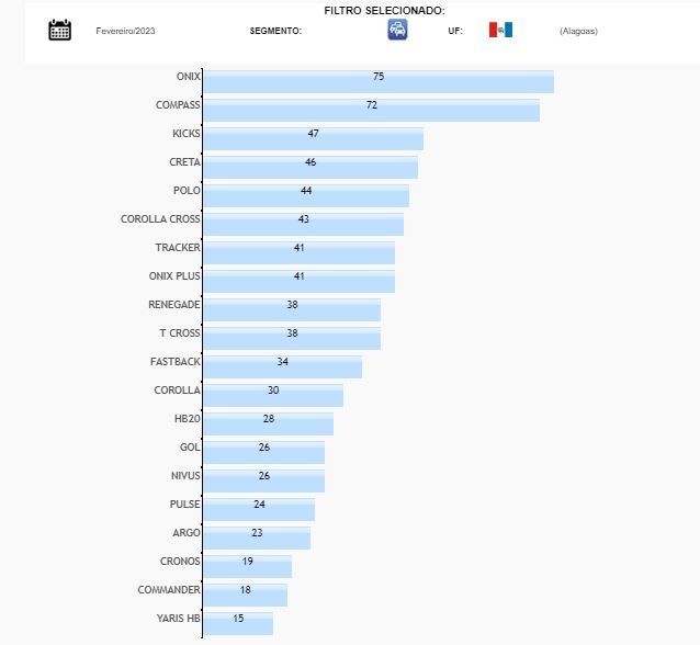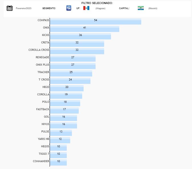 Já na capital o Compass levou a melhor. O SUV da Jeep emplacou 54 unidades contra 41 do Chevrolet Onix. Nissan Kicks, Hyundai Creta e Toyota Corolla Cross fecham o top 5. Confira o ranking até a 20ª posição: