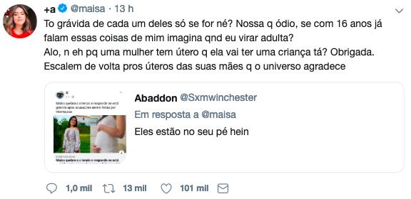 Namorando há pouco mais de um ano com Nicholas Arashiro, a adolescente ironizou internautas que estão circulando com uma montagem usando uma foto sua e de uma mulher grávida. “Tô grávida de cada um deles só de for, né? Nossa, que ódio. Se com 16 anos falam essas coisas de mim imagina quando eu virar adulta? Alô, não é porque uma mulher tem útero que ela vai ter uma criança, tá? Obrigada. Escalem de volta pros úteros das suas mães que o universo agradece”, disparou ela, que ira lançar seu primeiro talk-show neste próximo sábado.