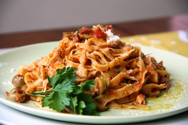 Minha paixão: talharim a Toscana com molho de tomates frescos, linguiça magra, cebolas, e para acentuar mais o sabor entra em cena as azeitonas, queijo parmesão e manjericão