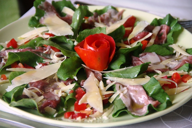 Parmesão – Carpaccio de carne (fatias finíssimas) com lascas de parmesão italiano, folhas de rúculas e azeite, entrada mais leve, acompanhada de duas torradas de pão e azeite com ervas.