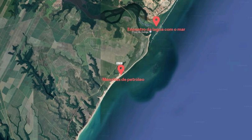 As manchas de petróleo chegaram nesta sexta (11) à região de estuário (encontro entre mar e lagoa) do Gunga, município de Roteiro, Litoral Sul de Alagoas. A substância preta foi encontrada próximo às falésias, no início da manhã deste sábado, pela equipe do Instituto Biota de Conservação, durante monitoramento realizado diariamente nas praias.