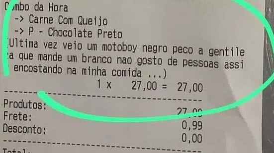A Polícia apura a autoria do pedido racista na nota de um pedido de comida por aplicativo na cidade de Campo Bom, no Rio Grande do Sul, na noite desta terça-feira. Na ocasião, o cliente reclamava sobre ter sido atendido por um motoboy negro antes e pedia que a situação não se repetisse.