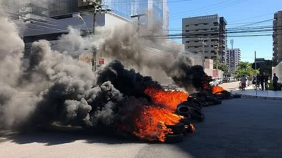 Foi ateado fogo em pneus para bloquear a passagem nos dois sentidos e pretendem fechar a rua em frente ao Juizado da Infância e da Juventude, paralela à José Lages.