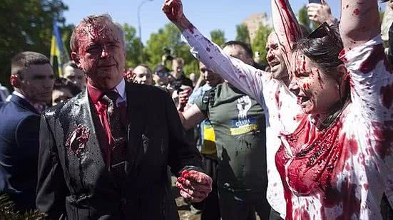 Manifestantes na Polônia lançaram tinta vermelha contra o embaixador russo no país, Sergei Andreev, nesta segunda-feira (9).