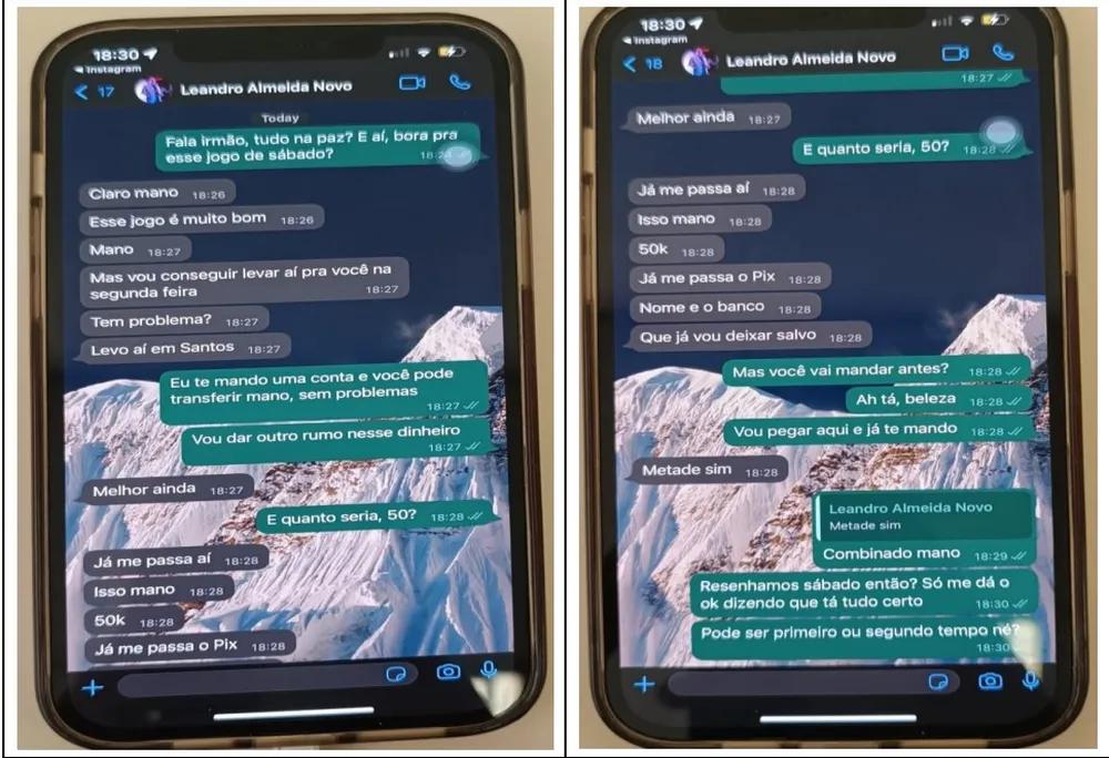 No processo ao qual o ge teve acesso, há prints da conversa em que Bauermann chama o apostador Leandro Almeida, que não está entre os denunciados, dias antes da partida e propõe: