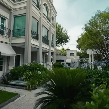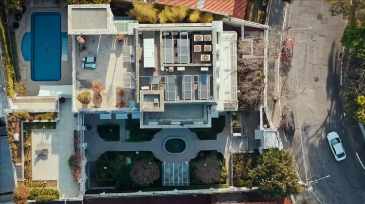 A casa soma 96 cômodos, com 37 banheiros e cinco cozinhas. Imagens aéreas exibidas na série mostram a área externa com muito verde.