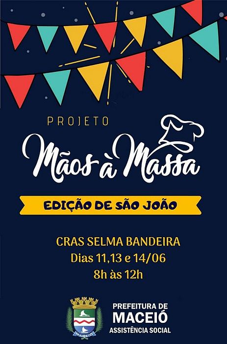 O projeto Mãos à Massa, composto por diversas oficinas culinárias, oferecerá, a partir do dia 11 de junho, um curso gratuito de comidas típicas de São João. O projeto é voltado para os usuários atendidos nos Centros de Referência de Assistência Social (Cras) e tem como objetivo proporcionar novas fontes de renda para as famílias em situação de vulnerabilidade.
