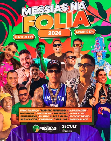 Messias: Com cinco dias de festa, Messias promete um carnaval envolvente com Pv Mello, Lá Fuleragem, Fabio Palhaço e muito mais.