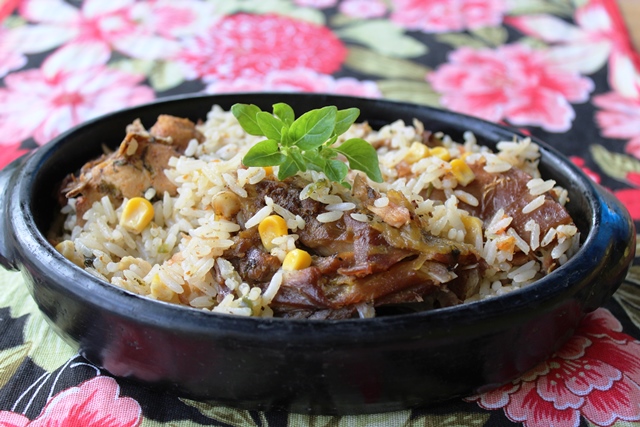 Misturado – A galinhada, tradição mineira, é o arroz misturado aos pedaços da ave com milho e temperos mineiros. Gostei tanto que fiz uma quentinha e trouxe para Maceió.