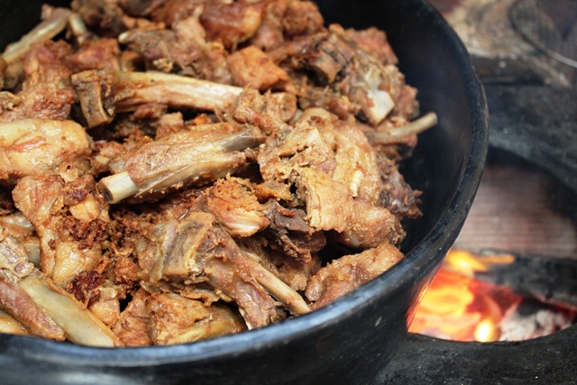 Fogo à lenha – Além da costelinha de porco, a galinha caipira guisada rende um delicioso pirão de lamber os beiços.