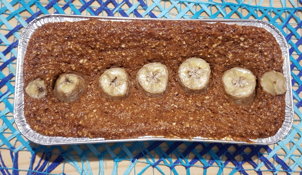 Bolo de banana com a doçura vem das próprias frutas, banana, ameixa, uva passa e tâmara, além de aveia e leite vegetal.