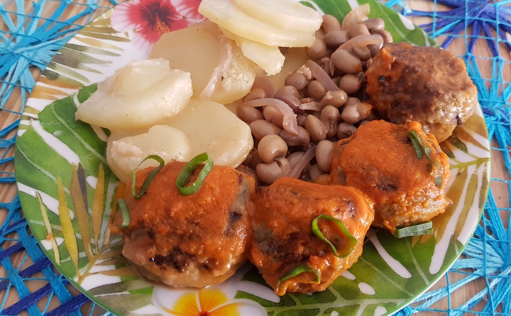 Almôndegas de berinjela com batatas e feijão verde