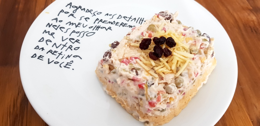 O Geladuíche de salpicão conquistou meu coração. Na receita, o pão úmido com recheio de tomate, maçã, milho verde, ervilha, azeitona, frango, passas e maionese, reforçou minhas memórias afetivas.