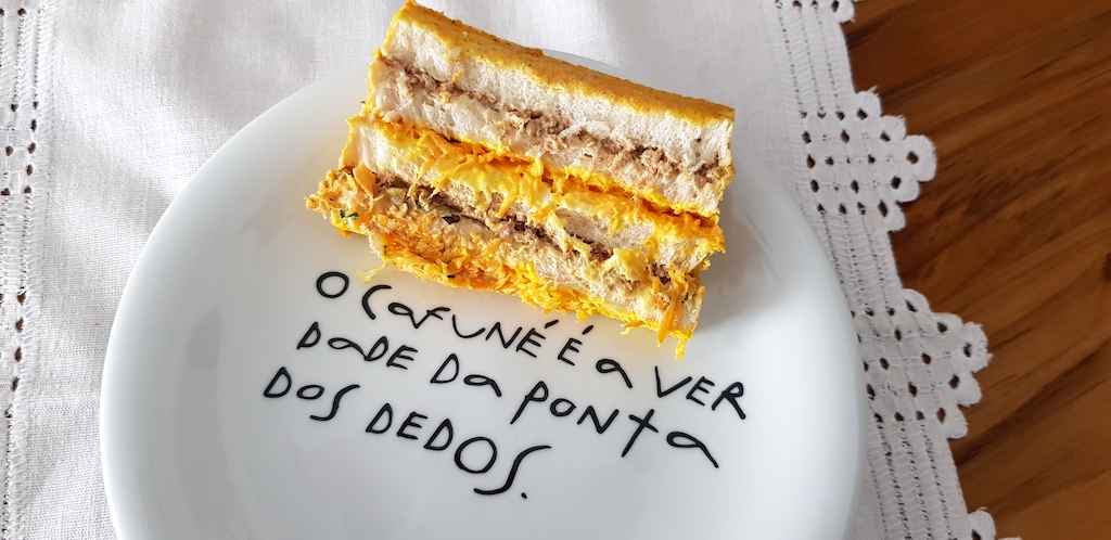 Os de atum com cenoura ou de sardinha também seguem a mesma gostosura e boas memórias. Os sanduíches todos tem um sabor principal (atum, bacalhau, camarão, frango, peito de peru, presunto, queijo temperado e sardinha) e o secundário (azeitona, beterraba, cenoura, kani kama, palmito, saladinha, salpicão e tomate). A gente escolhe o principal e o secundário, e ele é montado.