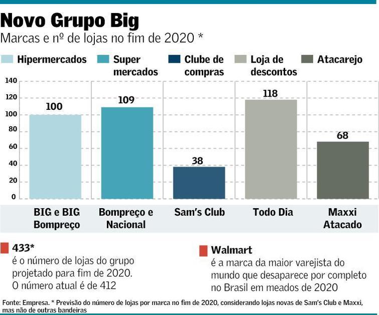 Com a reestruturação, o total de marcas de redes do grupo passa de nove para sete. Ao fim das conversões das lojas, serão 433 unidades, frente às atuais 412 (o aumento envolve aberturas de Sam's e Maxxi no período). Questionado sobre a redução discreta do portfólio, Fazzio menciona o resultado de pesquisas com 580 pessoas em cinco Estados, realizadas no fim do ano passado.