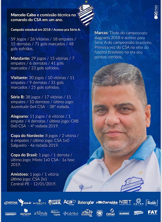 Marcelo Cabo foi apresentado oficialmente pelo CSA dia 19 de fevereiro de 2018, no CT do Mutange. Credenciado pelo título da Série B do Campeonato Brasileiro pelo Atlético-GO em 2016, Cabo disse na época que assumia o Azulão para ter grandes conquistas. Sob o comando do treinador, o CSA encerrou o jejum de títulos no Estadual, derrotou o rival CRB na final e foi campeão alagoano após 10 anos. A boa campanha se estendeu pelo Campeonato Brasileiro, onde conquistou 62 pontos e cravou o vice-campeonato e o acesso à Série A do Brasileirão após 32 anos.
