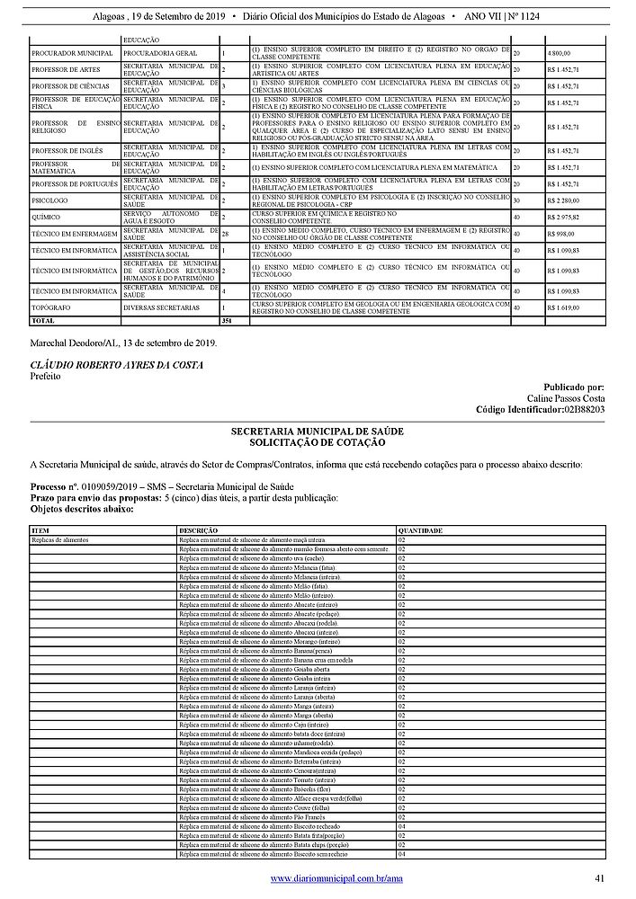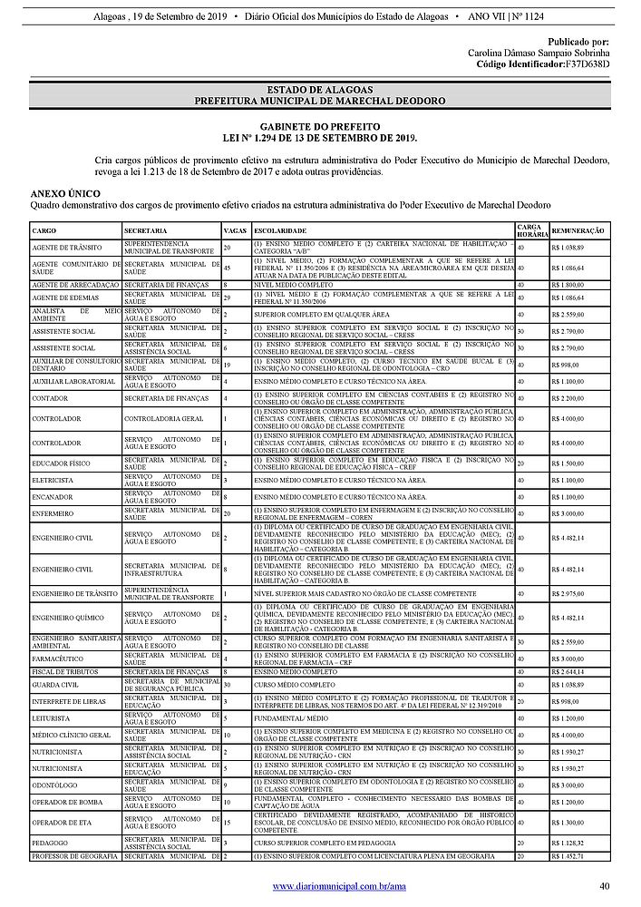 A Prefeitura de Marechal Deodoro divulgou o quadro demonstrativo dos cargos de provimento efetivo para concurso público do município no Diário Oficial desta quinta-feira (19). São 351 vagas, para nível Médio e Superior.