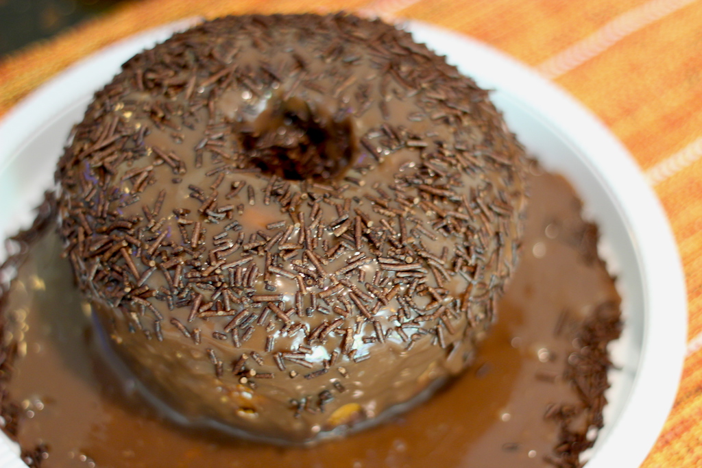 Bolo mesclado com cobertura de brigadeiro e sem glúten