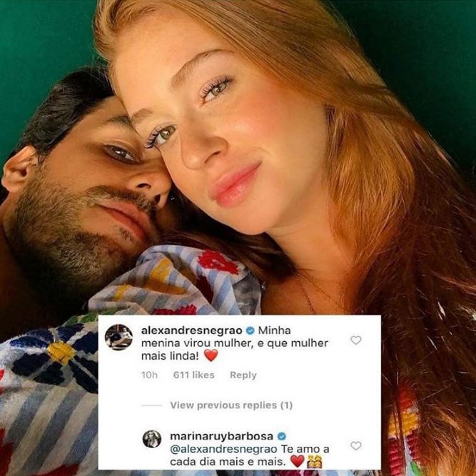 Marina posou para a nova edição da Marie Claire e postou a capa da revista em seu Instagram, falando, na legenda, sobre seu crescimento como mulher, e recebeu um comentário fofo do marido, o piloto Alexandre Negrão. Ele escreveu: Minha menina virou mulher, e que mulher mais linda! Marina, então, respondeu: Te amo a cada dia mais e mais!