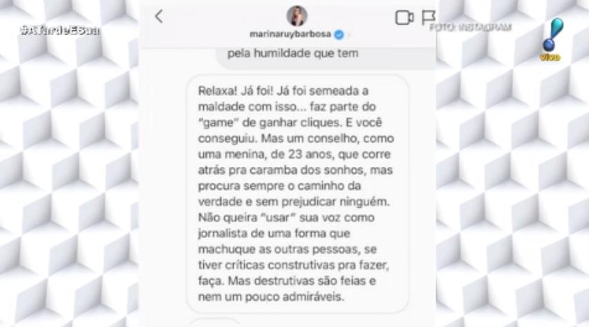 O assunto foi parar na TV e virou pauta no programa A Tarde é Sua, com Sonia Abrão, que ainda exibiu a mensagem enviada pela atriz para o jornalista em questão. No texto, ela mostrou toda a sua revolta e disparou: “Relaxa! Já foi! Já foi semeada a maldade com isso… faz parte do “game” de ganhar cliques. E você conseguiu”.
