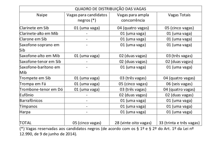 Serão oferecidas 33 vagas distribuídas nos seguintes naipes: