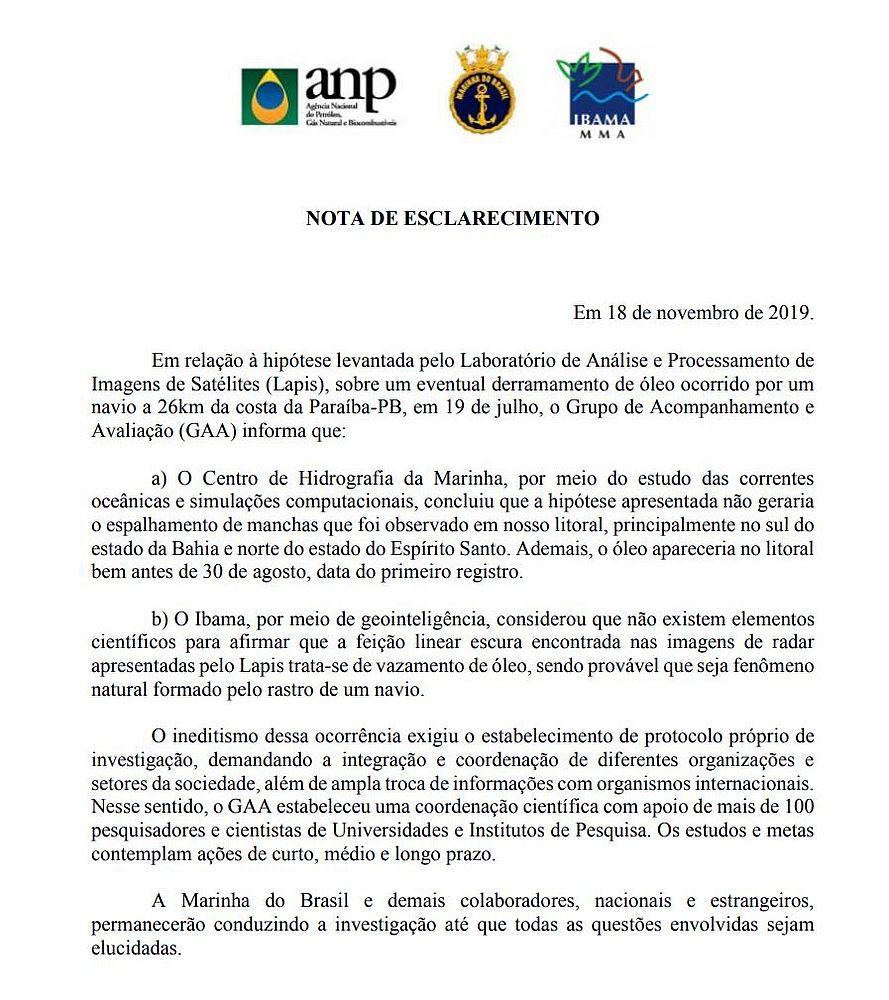 A corporação disse ainda que, caso a mancha apontada fosse real, o óleo apareceria no litoral bem antes de 30 de agosto, data do primeiro registro. O texto diz ainda que “o Ibama, por meio de geointeligência, considerou que não existem elementos científicos para afirmar que a feição linear escura encontrada nas imagens de radar apresentadas pelo Lapis trata-se de vazamento de óleo”. A Marinha afirma que a imagem é “fenômeno natural formado pelo rastro de um navio”.