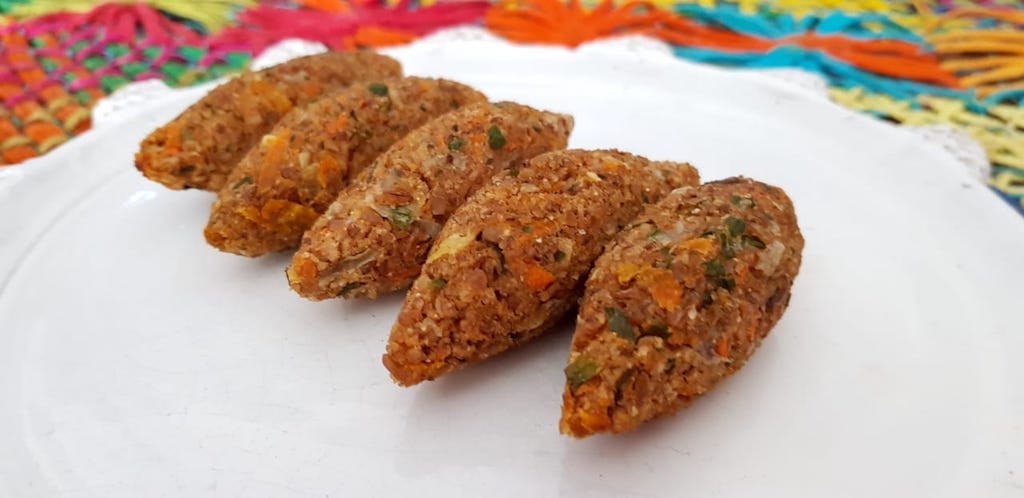 kibe, levam bastante cebola e alho, cheiro verde, limão, canela e hortelã. São dois sabores: berinjela e abóbora com cenoura.