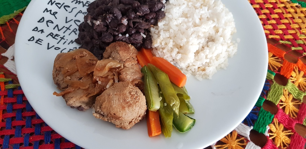 Além da comidinha fit de frango, também provei a mineirinha com filé suíno, arroz, legumes e feijão preto. Mais que perfeito. Da Sil, até o arroz é de comer sozinho, pois sempre vem polvilhado com alho, e, segundo a mineira, é preciso lavar bem até tirar toda aquela aguinha branca e deixar secar. Depois dourar em um pouquinho de banha de porco com bastante alho. Fica perfeito.