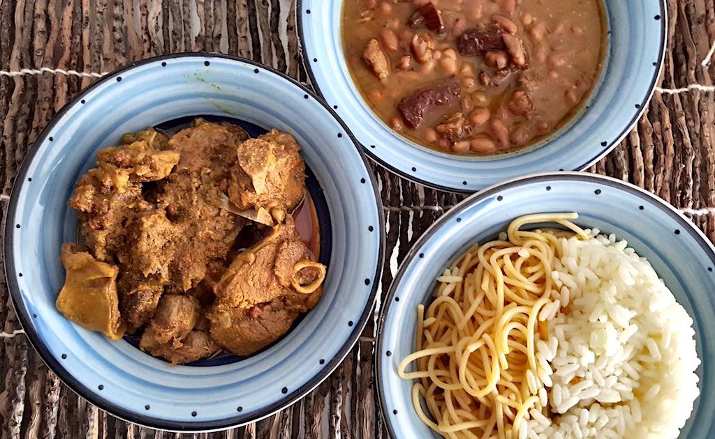 Carneirinho guisado com arroz, feijão, macarrão, purê ou maionese